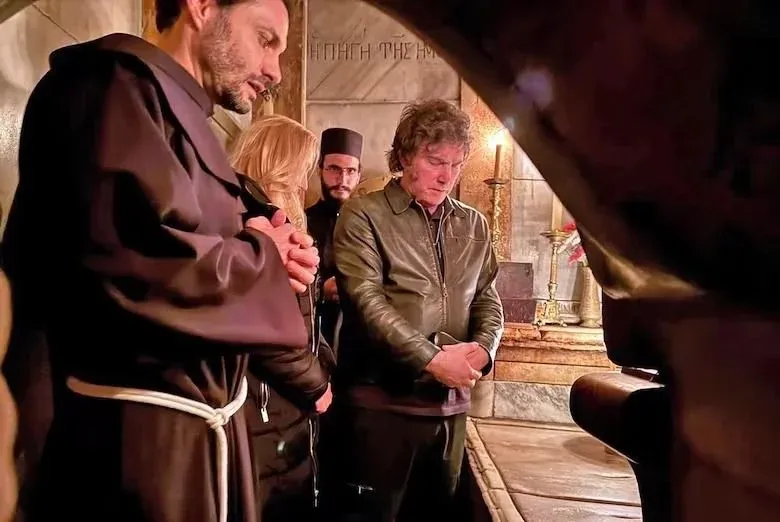 La visita tuvo un tono íntimo, a diferencia del martes, cuando Milei rezó en el Muro de los Lamentos rodeado de una multitud de periodistas, curiosos y fanáticos que lo rodearon. En una de las fotos Milei, siempre vestido con su campera de cuero negro, y su hermana, aparecen arrodillados y prendiendo unas velas en la piedra del Santo Sepulcro, un lugar sagrado. En otra, se los ve en la entrada del templo junto a dos frailes franciscanos, capuchinos, custodios de esta Iglesia que es propiedad de diversas congregaciones cristianas. De enormes piedras blancas típicas de Jerusalén, el templo alberga en su entrada la lápida de mármol en la que fue apoyado el cuerpo de Jesús después de su crucifixión -otro lugar venerado, que suele ser besado-.