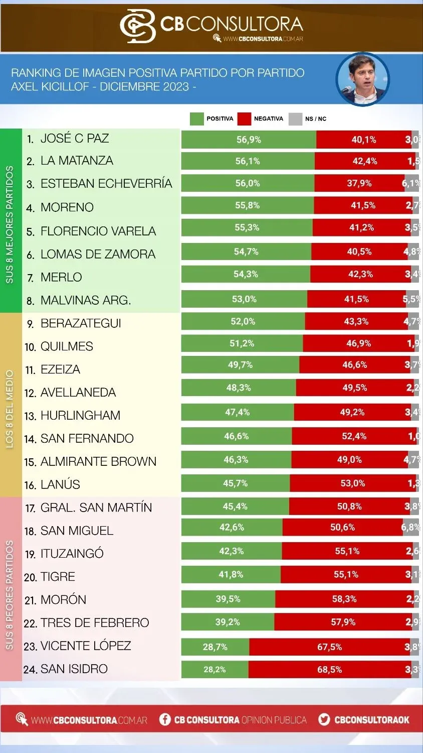 Por su parte, el gobernador de la Provincia de Buenos Aires, Axel Kicillof, obtiene en José C. Paz su imagen positiva más alta (56,9%), y en San Isidro (28,2%) su imagen positiva más baja. Son catorce los distritos donde el gobernador de PBA supera en imagen positiva al presidente Milei. En once partidos, la imagen negativa supera a la positiva.