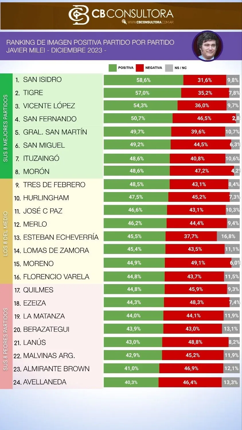 El presidente Javier Milei, cierra el año 2023 con su imagen más alta en San Isidro (58,6%) y la más baja en Avellaneda (40,3%). Milei supera a Axel Kicillof en diez de los veinticuatro distritos medidos. Y en sólo siete la imagen negativa supera a la positiva.