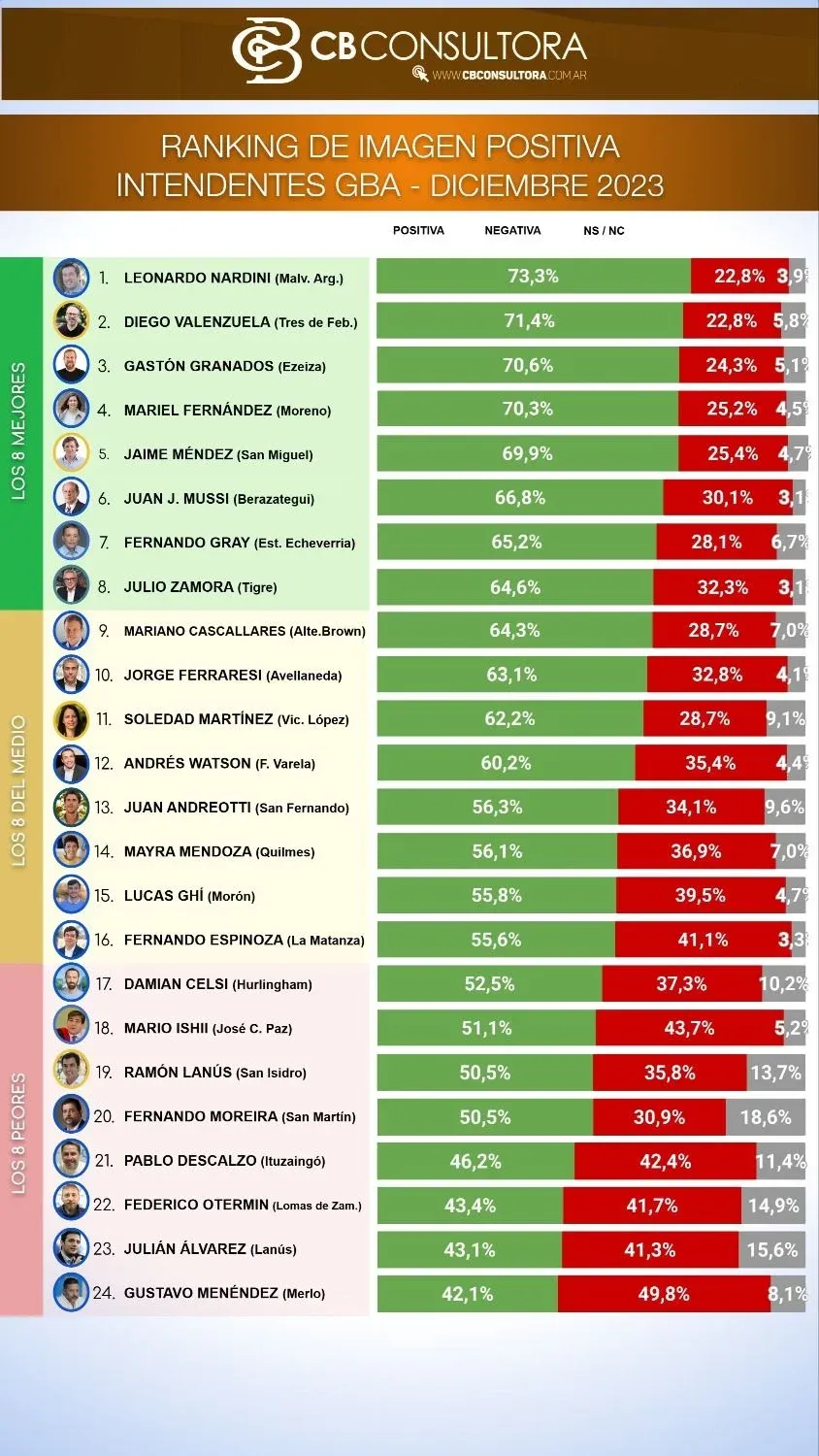 Por el lado de los intendentes a cargo de los municipios bonaerenses del AMBA, la encuesta de CB Consultora revela que los tres intendentes mejor valorados del mes de diciembre de 2023 por sus vecinos son: Leonardo Nardini de Malvinas Argentinas con 73,3% de imagen positiva; en segundo lugar quedó el Intendente de Tres de Febrero, Diego Valenzuela con 71,4%, y cerró este podio Gastón Granados de Ezeiza con7 0,6% de imagen positiva.