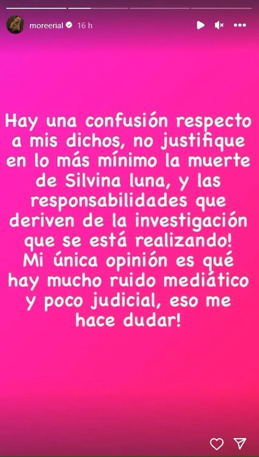 Luego de su posteo a Morena Rial le llovieron las críticas y no ajena a la polémica hizo un descargo en Instagram Stories: “Hay una confusión respecto a mis dichos, no justifiqué en lo más mínimo la muerte de Silvina Luna ni las responsabilidades que deriven de la investigación que se está realizando”
