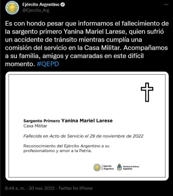 “Acompañamos a su familia, amigos y camaradas en este difícil momento”, reza el comunicado difundido por el Ejército argentino.