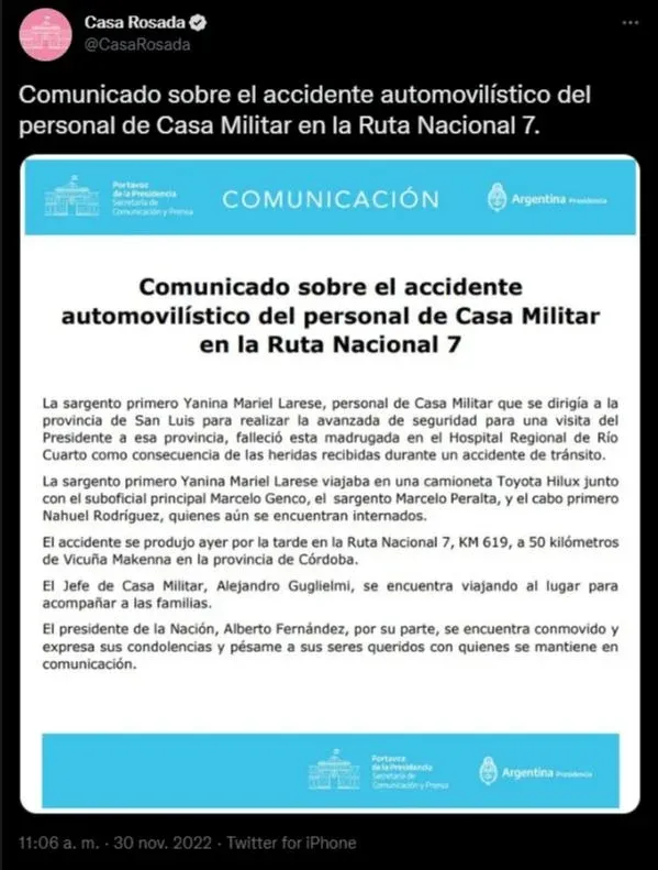 Finalmente, desde la Casa Rosada se emitió un comunicado donde detalló que los otros tres integrantes de la camioneta que volcó permanecen internados. Se trata del suboficial principal Marcelo Genco, el sargento Marcelo Peralta y el cabo primero Nahuel Rodríguez. "El Jefe de Casa Militar, Alejandro Guglielmi, se encuentra viajando al lugar para acompañar a las familias", indica el texto.