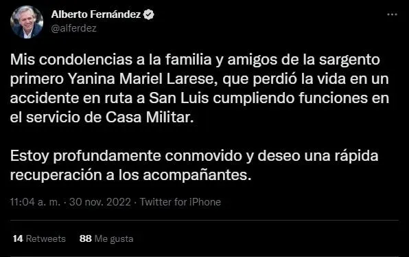Alberto Fernández también escribió en Twitter, donde envió sus condolencias a la familia y amigos de la fallecida. "Estoy profundamente conmovido y deseo una rápida recuperación a los acompañantes", afirmó.