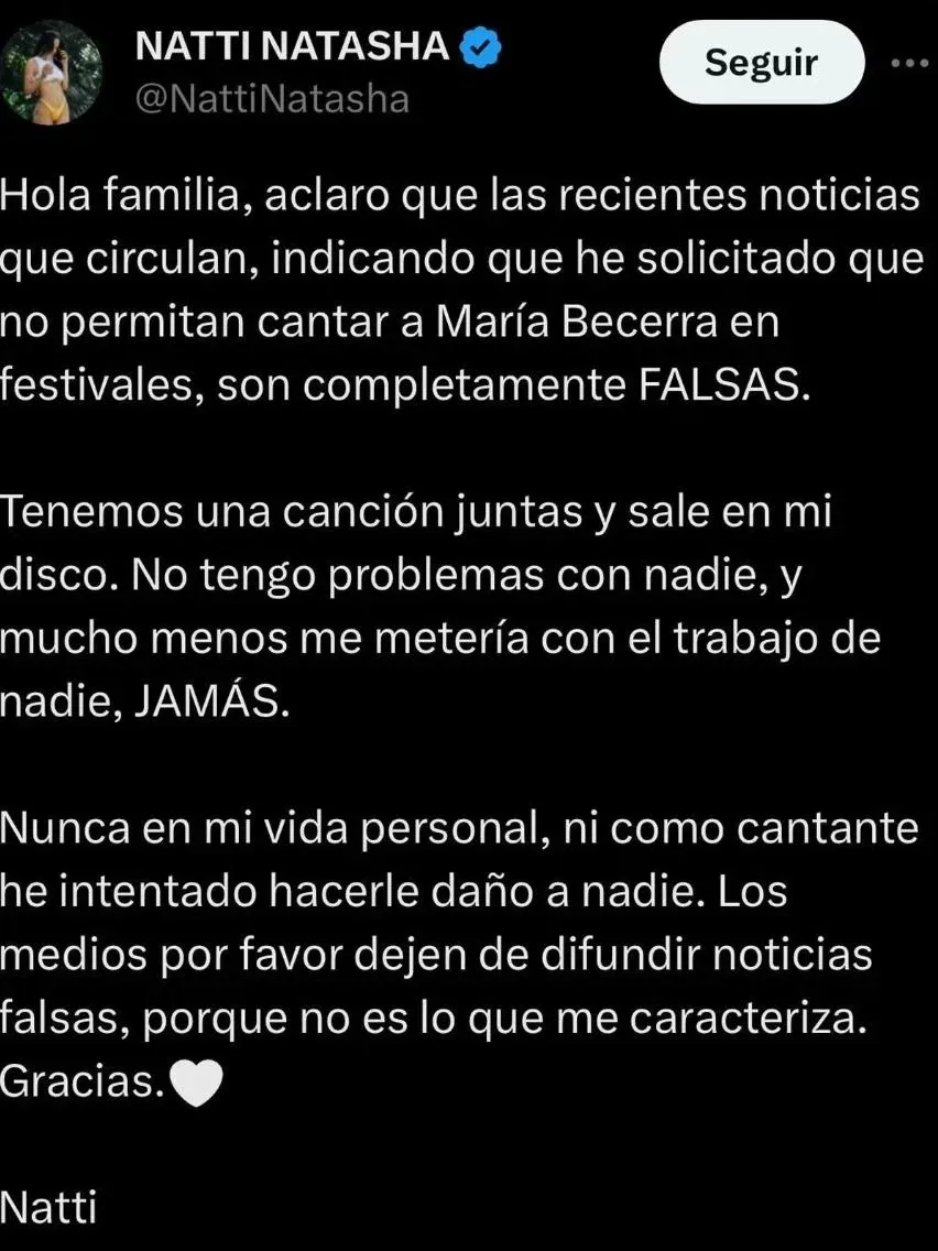 Rápidamente, comenzaron a circular rumores de que la responsable detrás de las acusaciones de María Becerra era Nati Nattasha, pero ella salió personalmente a través de sus redes sociales a desmentirlo. Según destaca la cantante de República Dominicana, ambas tienen una muy buena relación e incluso trabajaron juntas en una canción de su próximo disco.