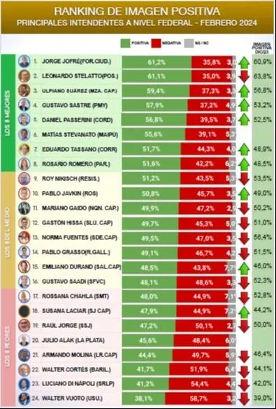 En cuanto a los intendentes, la encuesta muestra que los tres mejor valorados por sus vecinos en el mes de febrero de 2024 son: Jorge Jofré, de la ciudad de Formosa (61.2%), Leandro Stelatto, de Posadas (61.1%), y Ulpiano Suárez, de la ciudad de Mendoza (59.4%).