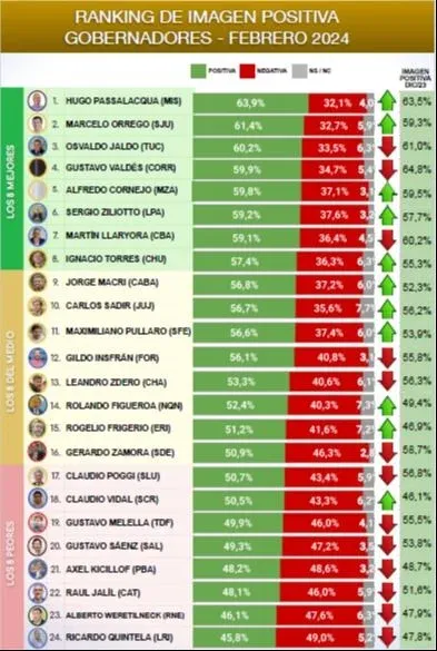 Por el lado de los gobernadores, los tres mejor valorados por los habitantes de sus respectivas provincias en el mes de febrero de 2024 son los siguientes: Hugo Passalacqua, gobernador de la provincia Misiones, con 63,9%; en segundo lugar quedó Marcelo Orrego, de San Juan, con 61,4%