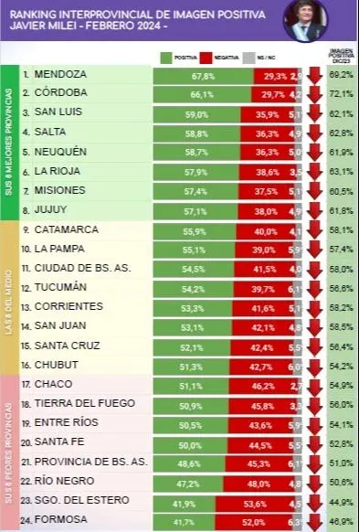 El presidente Javier Milei comenzó el año 2024 con caídas moderadas de su imagen positiva en todas las provincias del país. Su imagen positiva más alta se da en la provincia de Mendoza, con un 67,8% de imagen positiva, mientras que la más baja se observa en la provincia de Formosa con 41,7%. La provincia donde más cayó comparado a la medición anterior fue Córdoba (-6%).