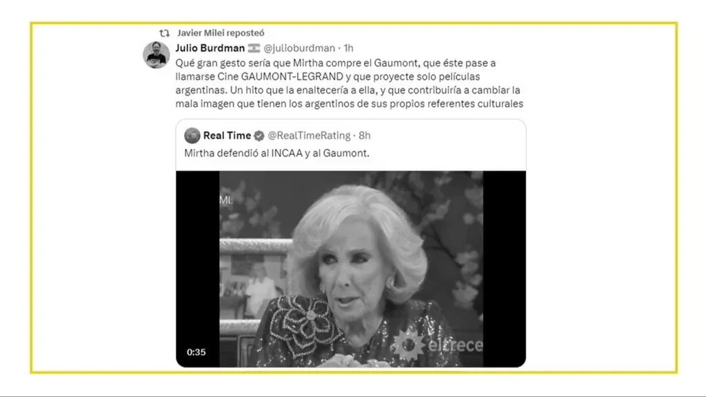La respuesta de Milei no tardó en llegar. Al día siguiente, el mandatario mostró su descontento con los comentarios de la conductora y reposteó un mensaje que le sugerían a la diva hacerse del espacio cultural. “Qué gran gesto sería que Mirtha compre el Gaumont, que éste pase a llamarse Cine GAUMONT-LEGRAND y que proyecte solo películas argentinas. Un hito que la enaltecería a ella, y que contribuiría a cambiar la mala imagen que tienen los argentinos de sus propios referentes culturales”, rezaba el texto publicado por el politólogo Julio Burdman.