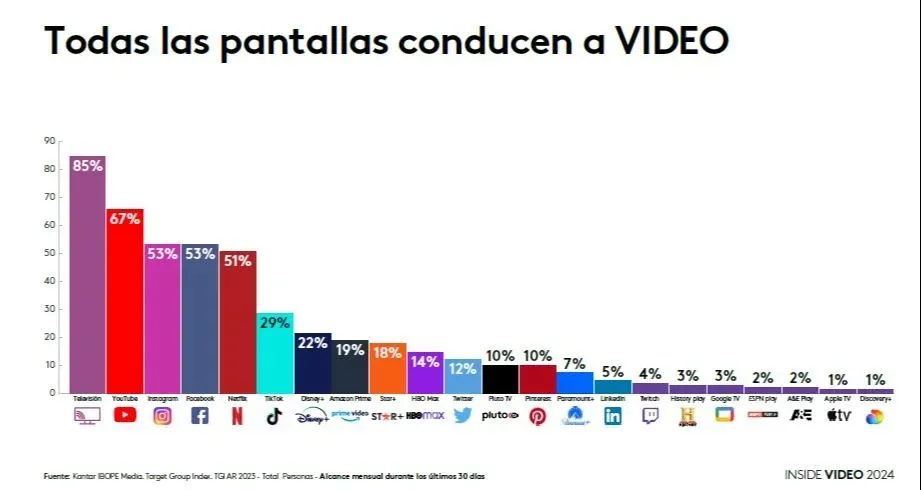 Un estudio de la empresa Kantar IBOPE Media sobre las tendencias del video y la publicidad en la era crossmedia muestra que en la Argentina crece el interés por los servicios de streaming y el consumo de videos en las distintas redes sociales, pero que, de todos modos, la televisión sigue siendo el consumo audiovisual número 1 del país.
