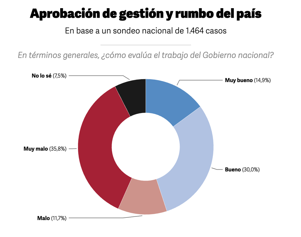 En el apartado de confianza pública, el Gobierno aparece con números ajustados y levemente desfavorables. El 44,9% califica la gestión como positiva, mientras que el 47,6% la evalúa de manera negativa. Es una diferencia corta, pero suficiente para ubicar el balance general en terreno adverso.