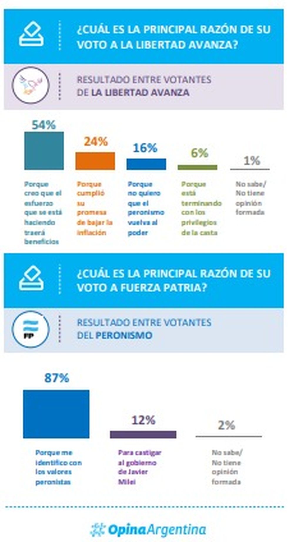 Entre los votantes de Fuerza Patria, la razón principal del voto es la identificación con los valores peronistas (87%) antes que el castigo a Milei (12%).