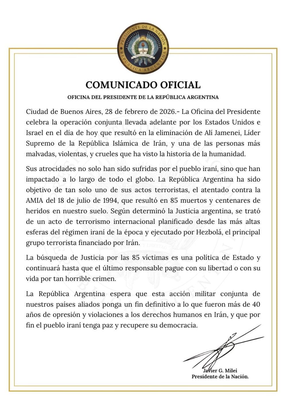 “La República Argentina reafirma su solidaridad con el pueblo iraní, que a lo largo de los años ha manifestado con valentía su aspiración a vivir en libertad, con pleno respeto de los derechos humanos y del derecho internacional”, señaló el escrito.
