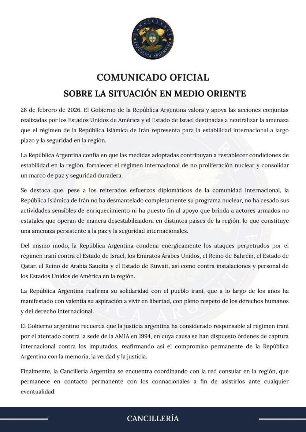 El Gobierno nacional apoyó este sábado las acciones conjuntas realizadas por los Estados Unidos e Israel “destinadas a neutralizar la amenaza que el régimen de Irán representa para la estabilidad internacional a largo plazo y la seguridad en la región”.
