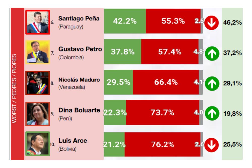 El ranking de presidentes de Sudamérica de junio de 2025, elaborado por CB Consultora Opinión Pública, muestra un panorama claro sobre las percepciones ciudadanas de los mandatarios de la región. Javier Milei, presidente de Argentina, encabeza la lista con un 53,5% de imagen positiva, consolidando su liderazgo. En segundo lugar se posiciona Daniel Noboa de Ecuador, con un 52,4% de aprobación, y cierra el podio Yamandú Orsi de Uruguay, con un 47,2% de apoyo.