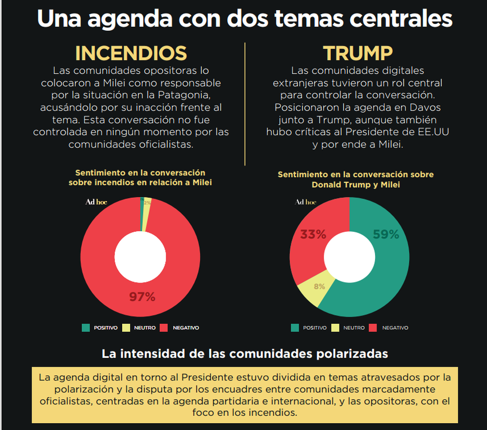 A pesar de este equilibrio estadístico, el mandatario logró sostener su cuarto mes consecutivo con indicadores de favorabilidad en el ecosistema digital, apoyado principalmente por la actividad orgánica de sus comunidades de seguidores y una agenda de política exterior sumamente activa. Sin embargo, la crisis derivada de los incendios forestales en la Patagonia interrumpió la hegemonía del relato oficialista, al instalar una agenda de reclamos sociales que afectó la reputación gubernamental en el inicio del año y obligó al Poder Ejecutivo a recalibrar su comunicación.