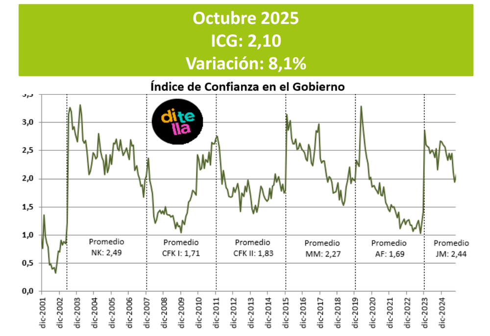 El Índice de Confianza en el Gobierno (ICG) aumentó 8,1% en octubre respecto del mes anterior y alcanzó 2,10 puntos, según informó la Escuela de Gobierno de la Universidad Torcuato Di Tella. La recuperación se produjo luego de dos descensos consecutivos que habían llevado al indicador desde 2,45 puntos en julio hasta 1,94 en septiembre, y muestra una mejora similar a los indicadores de consumo difundidos la semana pasada.