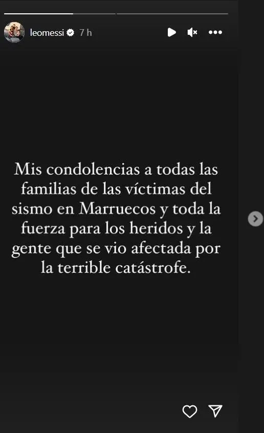 El rosarino utilizó su cuenta oficial de Instagram para escribir un breve mensaje en una historia con fondo negro: "Mis condolencias a todas las familias de las víctimas del sismo en Marruecos", escribió Messi.
