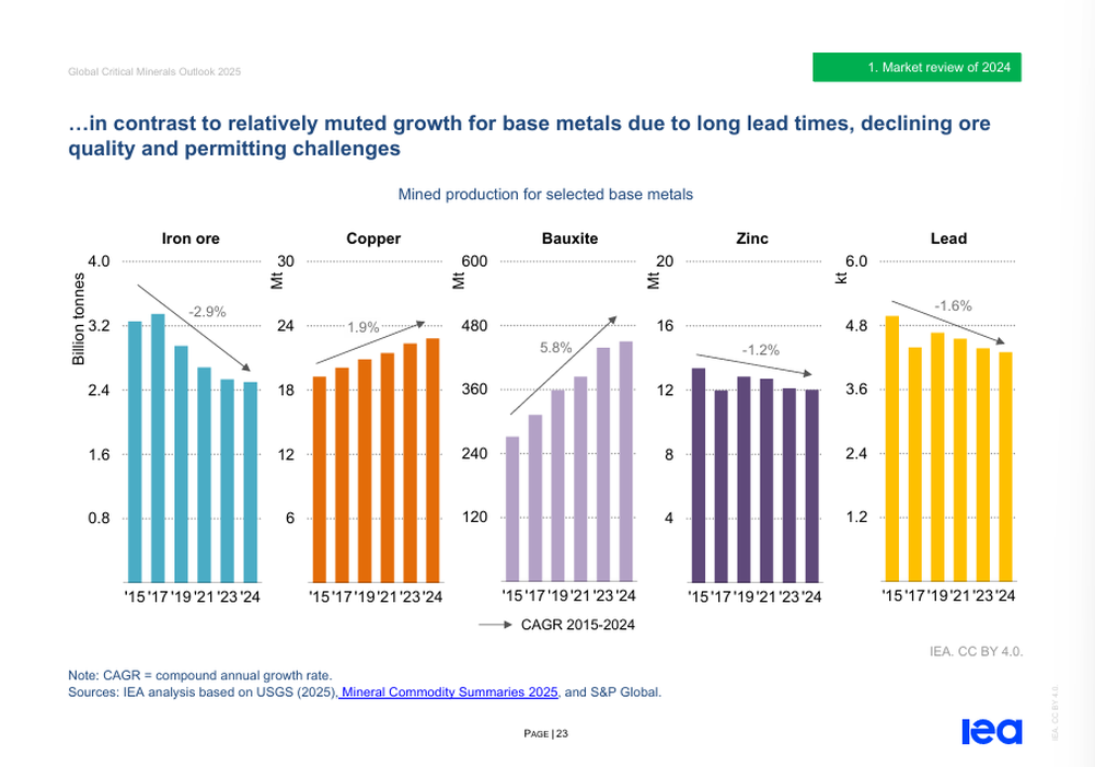 La producción de cobre crece, pero a un ritmo significativamente menor que el de los metales de baterías, según la IEA.