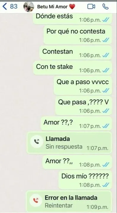 "¿Dónde estás? ¿Por qué no contestás?", fueron los primeros mensajes que Salomón le envió a Betiana al notar que algo no estaba bien. Un minuto después, al no recibir respuesta, envió otro mensaje: "Dios mío", presintiendo la tragedia.