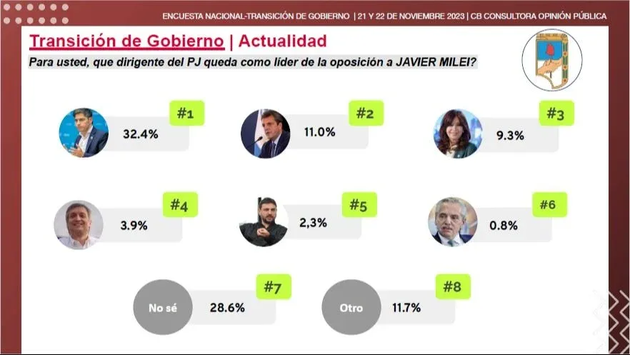 El último asunto a tratar en el estudio es acerca de quién será de ahora en más la principal figura de la oposición, con el gobernador de la Provincia de Buenos Aires, Axel Kicillof, como la respuesta más frecuente: