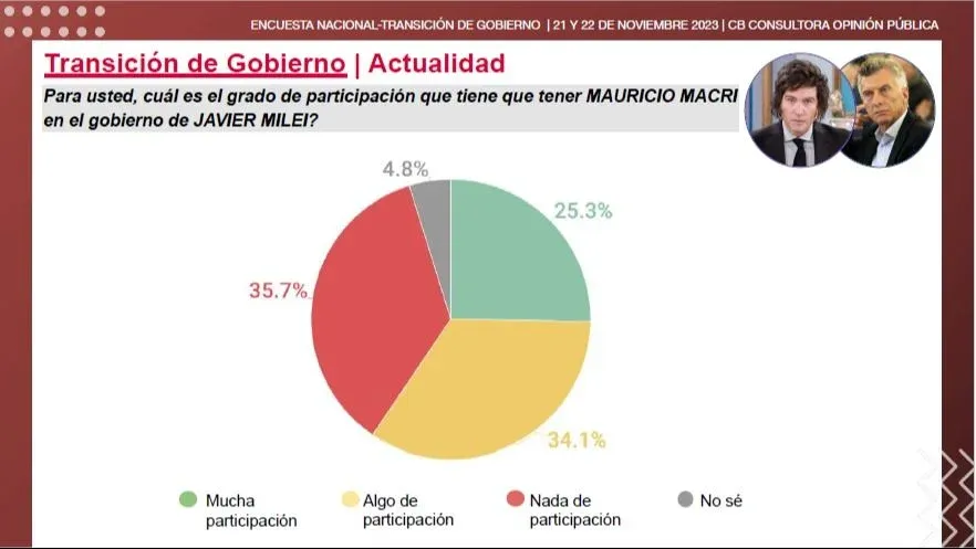 El estudio también incluye opiniones acerca del rol del ex presidente Macri y su acuerdo con La Libertad Avanza. Concretamente, la pregunta apuntó a saber por el grado de participación que debería tener Macri en el nuevo gobierno: