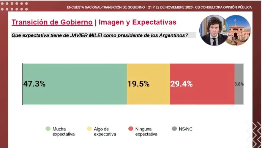 Un estudio privado de la Consulta CB Opinión Pública arroja resultados interesantes acerca de la imagen actual del presidente electo Javier Milei y de lo que se espera de su gobierno. La encuesta además incluye preguntas acerca del apoyo del ex presidente Macri al nuevo gobierno en formación y sobre el futuro económico inmediato del país, así también como sobre el rol de la oposición y sus principales figuras.
