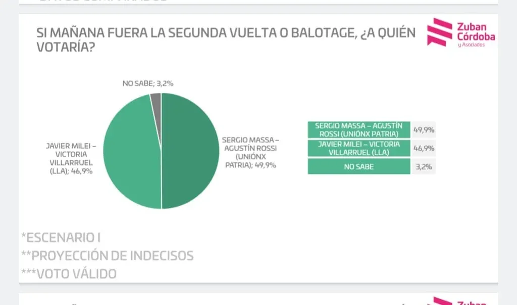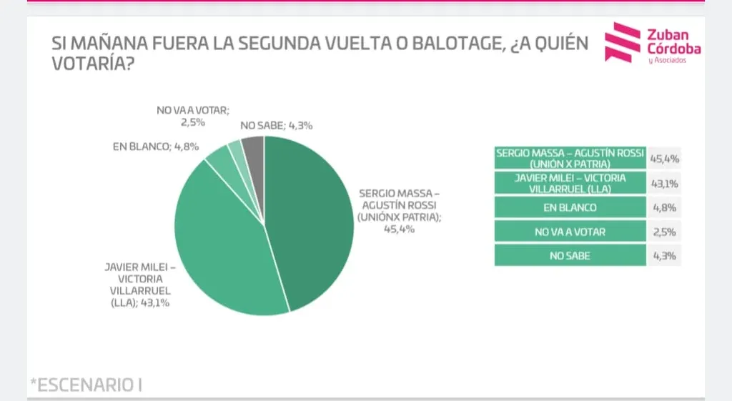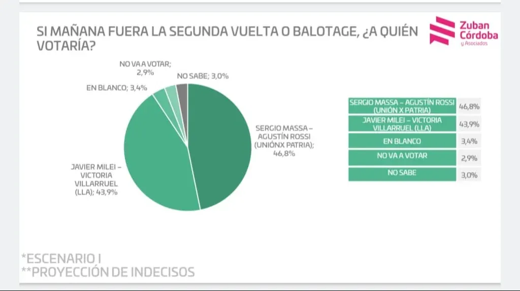 Para Zuban Córdoba el binomio Massa-Rossi tiene una intención de voto del 45,4% frente a un 43,1% de Milei-Villarruel. A eso hay que sumarle el voto en blanco que alcanza 4,8%, los indecisos que suman un 4,3% y los que manifiestan que no va a votar que representan el 2,5%.