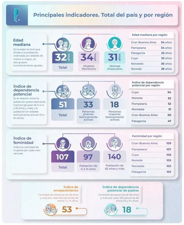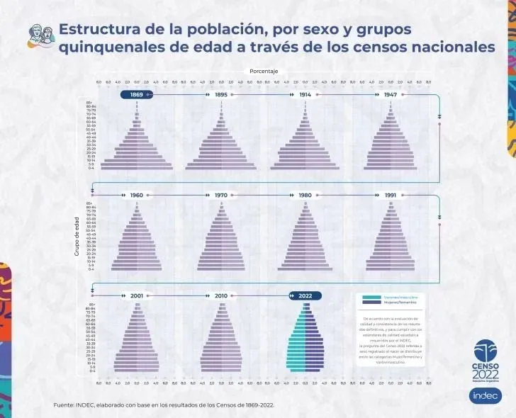 Los resultados publicados por el INDEC permiten visualizar la evolución de la estructura de la población en el territorio argentino desde 1869. Esto se logra a través de las pirámides por sexo y grupos quinquenales de edad que se desprenden de los censos nacionales realizados a lo largo de la historia del país.