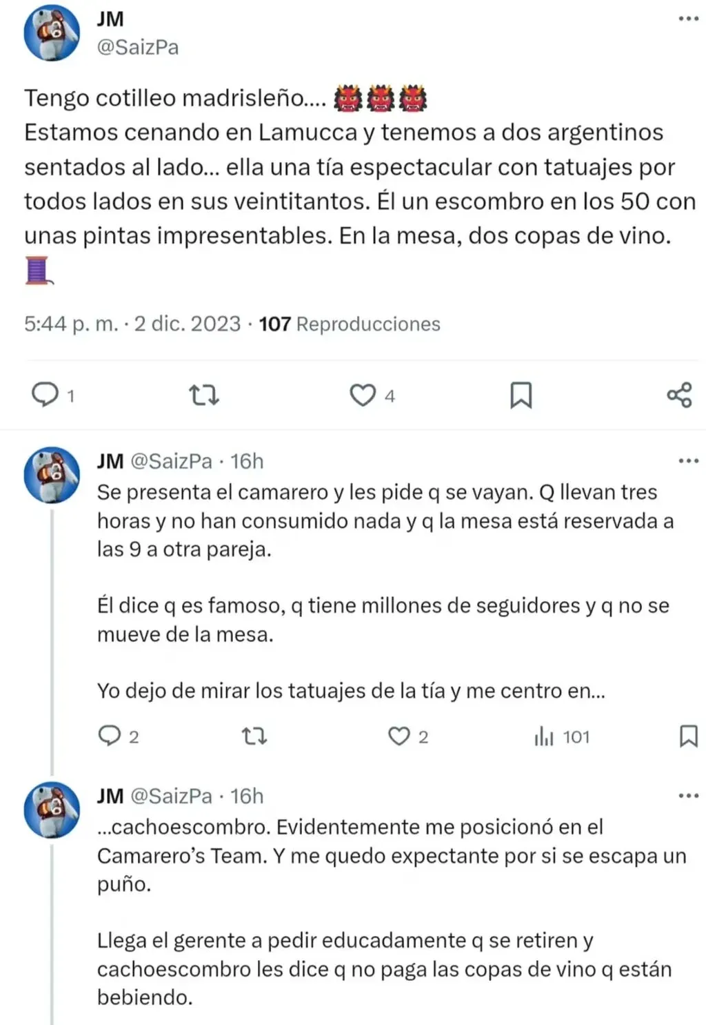 “Tengo cotilleo madrileño”, comenzó relatando uno de los clientes que estuvo en el restaurante en la mencionada red social, y agregó que “tenemos a dos argentinos sentados al lado. Ella una tía espectacular con tatuajes por todos lados, él con las uñas pintadas impresentables. En la mesa, dos copas de vino”.