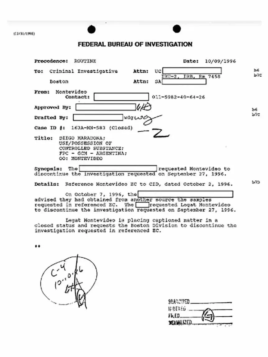 El documento publicado, fechado el 2 de octubre de ese año, resume que investigadores no identificados "solicitaron la asistencia del FBI para determinar si el laboratorio de Boston, que condujo el análisis de la orina de Maradona durante la Copa Mundial de 1994, aún preservaba una muestra".