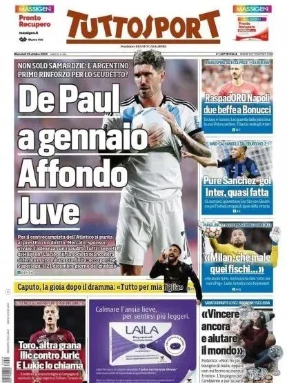Rodrigo De Paul está en las portadas de todos los portales italianos. Es que el volante del Atlético Madrid es uno de los principales apuntados por la Juventus para la próxima temporada de la Serie A.