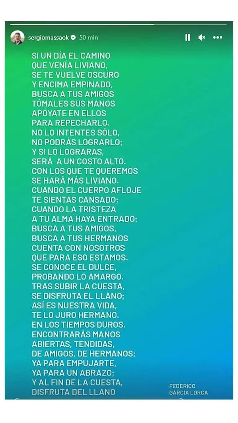 "Si un día el camino que venía liviano se te vuelve obscuro, y encima empinado, busca a tus amigos. Toma sus manos; apóyate en ellos para repecharlo. No lo intentes solo, no podrás lograrlo; y si lo lograras, será a un costo alto. Con los que te queremos, se hará más liviano", comienza el poema compartido por Massa.