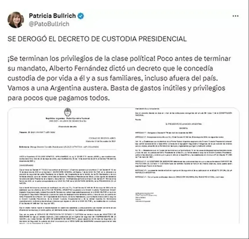 Luego de que se haya anunciado la derogación del decreto de Alberto Fernández sobre la cobertura de custodia fuera del país, la norma aún no está en el Boletín Oficial. De hecho, Patricia Bullrich eliminó su mensaje de celebración.