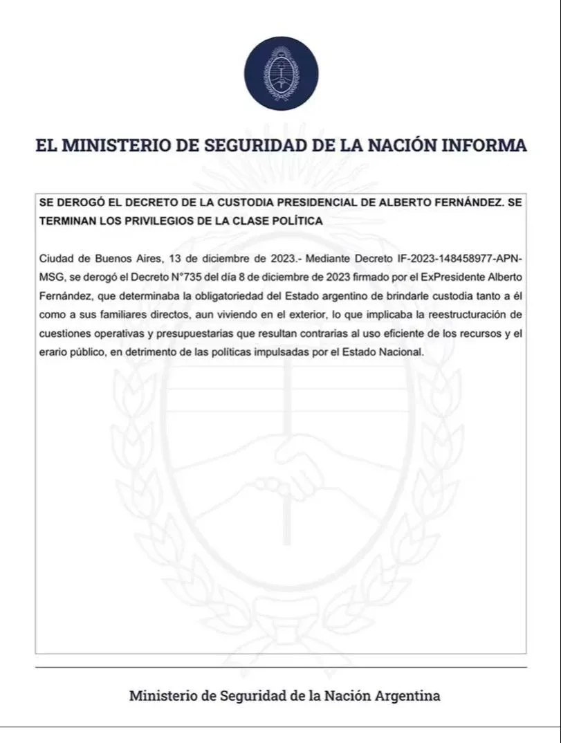 Además, mediante un comunicado, la entidad expresó: “Se derogó el Decreto N°735 del día 8 de diciembre de 2023 firmado por el ExPresidente Alberto Fernández, que determinaba la obligatoriedad del Estado argentino de brindarle custodia tanto a él como a sus familiares directos, aun viviendo en el exterior, lo que implicaba la reestructuración de cuestiones operativas y presupuestarias que resultan contrarias al uso eficiente de los recursos y el erario público, en detrimento de las políticas impulsadas por el Estado Nacional”.