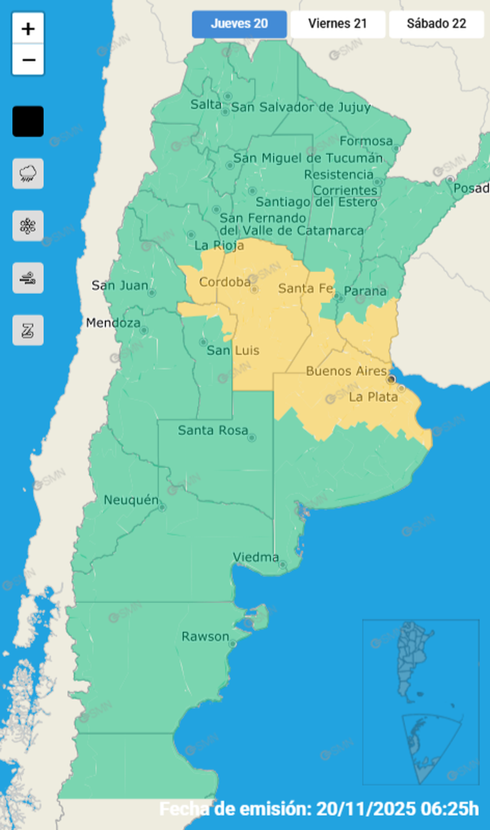 El Servicio Meteorológico Nacional (SMN) activó la alerta amarilla por tormentas que se registrarán este jueves 20 de noviembre en la Ciudad de Buenos Aires, zona norte de la provincia deBuenos Aires y otros cinco distritos del país.