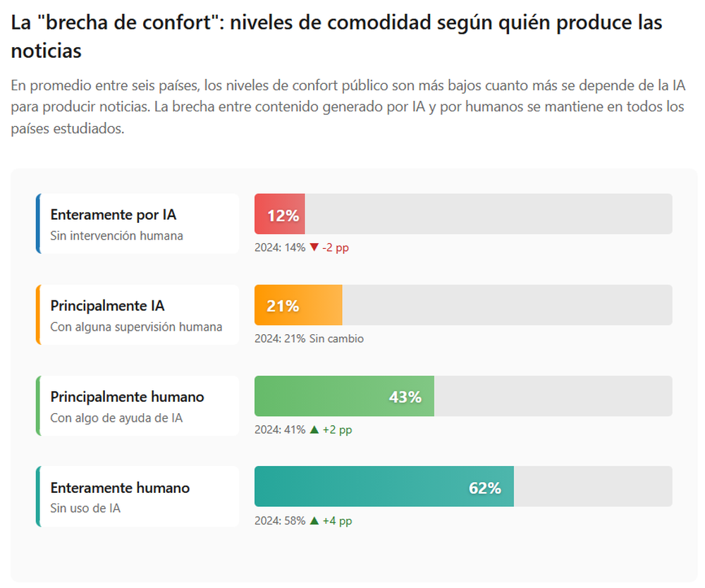 A pesar del uso masivo de IA en otras áreas, la cautela se mantiene cuando se trata de noticias. Solo el 12% de los encuestados a nivel global se siente cómodo con noticias producidas enteramente por inteligencia artificial. Esta cifra sube levemente al 21% si existe supervisión humana, alcanza el 43% cuando un humano lidera el proceso con ayuda de IA, y llega al 62% para noticias hechas completamente por periodistas humanos.