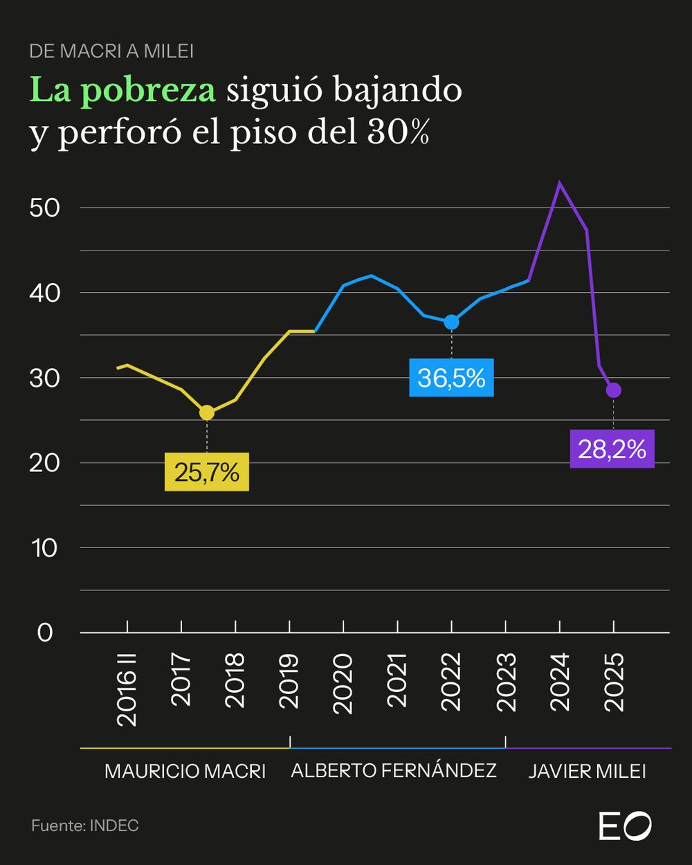 El índice cayó al 28,2% en el segundo semestre de 2025, según el INDEC. Son los números más bajos desde 2018.