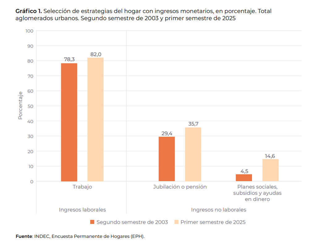El documento destacó que en las últimas dos décadas se produjo un aumento de 6,3 puntos porcentuales en los hogares que vivieron de jubilaciones o pensiones, que pasaron del 29,4% en 2003 al 35,7% en 2025. Este incremento refleja la expansión del sistema previsional argentino y su consolidación como una de las principales fuentes de ingresos no laborales de las familias.
