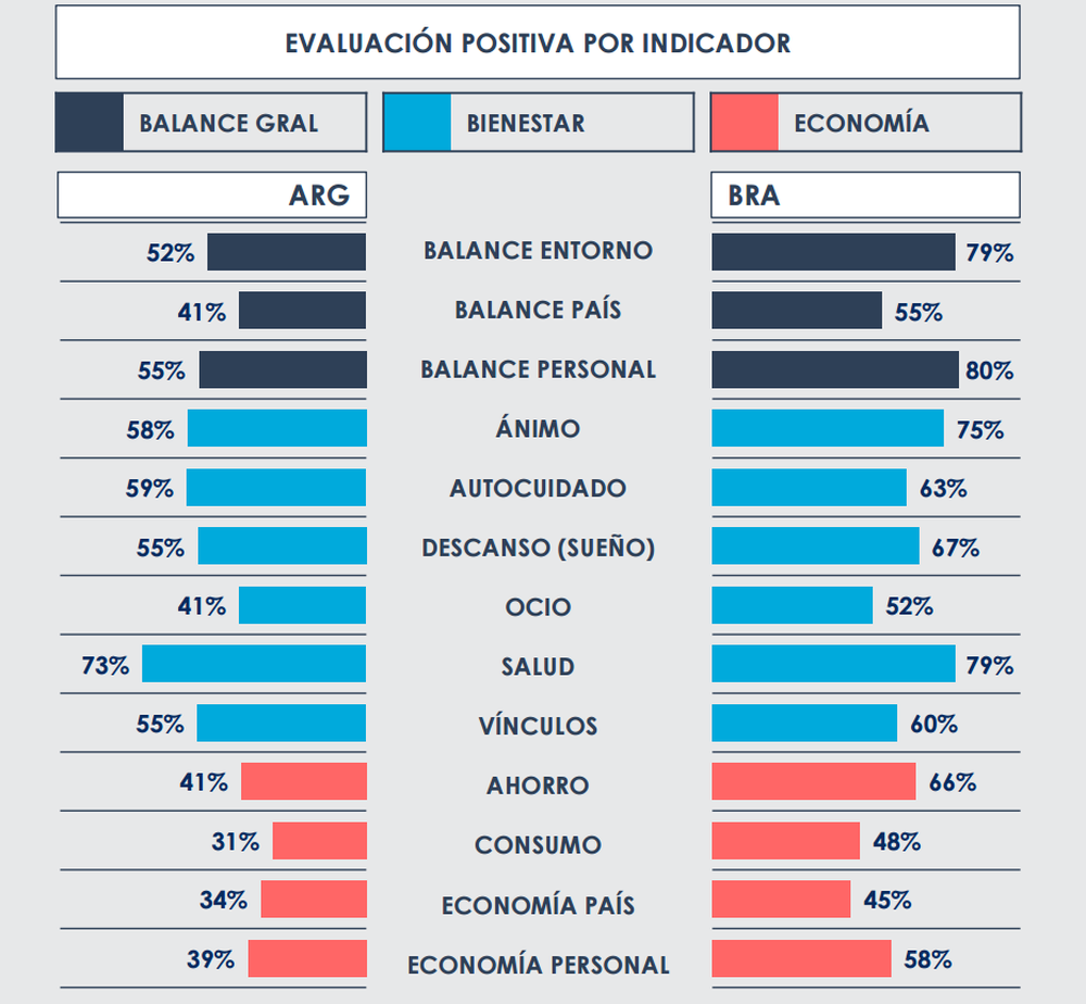 El relevamiento incluyó variables específicas como ánimo, autocuidado, descanso, ocio, salud, ahorro y consumo. En casi todas ellas, Brasil superó a Argentina, aunque las mayores brechas se concentraron en los indicadores económicos. La economía del país fue uno de los puntos más críticos para Argentina: solo el 31% la evaluó positivamente, frente al 55% en Brasil.