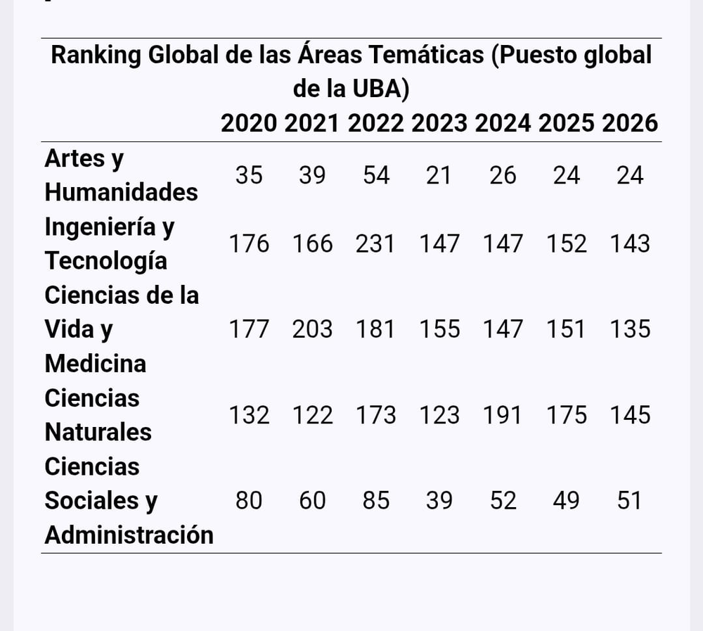 Además de las cinco disciplinas en el top 50, la UBA mantuvo presencia dentro del top 100 en varias áreas. Arquitectura/Entorno Construido, Historia, Comunicación y Medios, y Veterinaria se ubicaron en el puesto 51°, mientras que Sociología alcanzó el 64°, Arte y Diseño el 74° y Política y Estudios Internacionales el 99°.