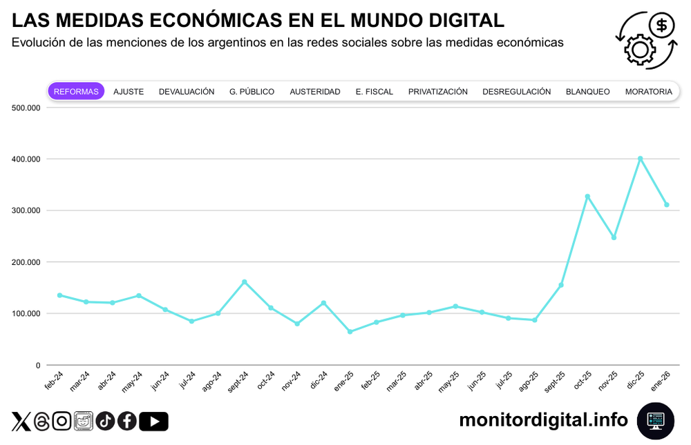 Las menciones a “reformas” y “ajuste” dominaron la conversación económica en redes sociales argentinas durante 2024 y 2025, en un contexto atravesado por el programa fiscal del Gobierno de Javier Milei, la salida parcial del cepo y el nuevo esquema cambiario acordado con el FMI. El clima digital se mantuvo mayormente en terreno negativo, con picos de enojo en momentos clave y un rechazo especialmente marcado a medidas como el blanqueo, la privatización y la devaluación.