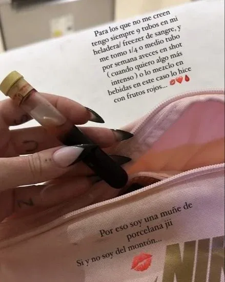 En su siguiente publicación, la mujer vinculada al político Martín Insaurralde explicó: "Para los que no me creen, tengo siempre nueve tubos de sangre en mi heladera/ freezer y me tomo 1/4 o medio tubo por semana. A veces en shot (cuando quiero algo más intenso ) o lo mezclo en bebidas en este caso lo hice con frutos rojos".