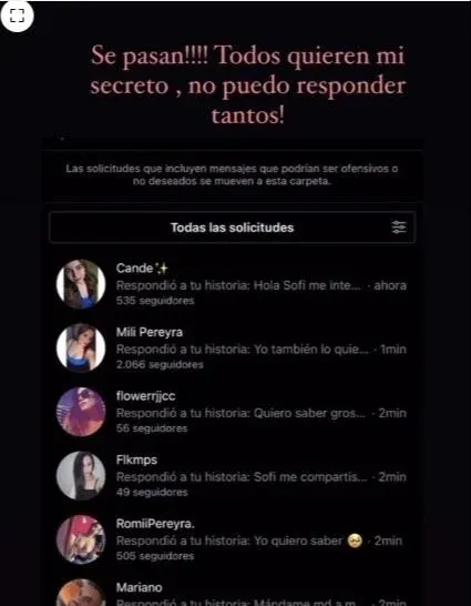 Luego, Clerici compartió otra captura de pantalla que mostraba todos los mensajes privados que había recibido en su cuenta de Instagram después de revelar que consumía su propia sangre. "Se pasan, todos quieren mi secreto, no puedo responder tantos", lamentó la influencer.