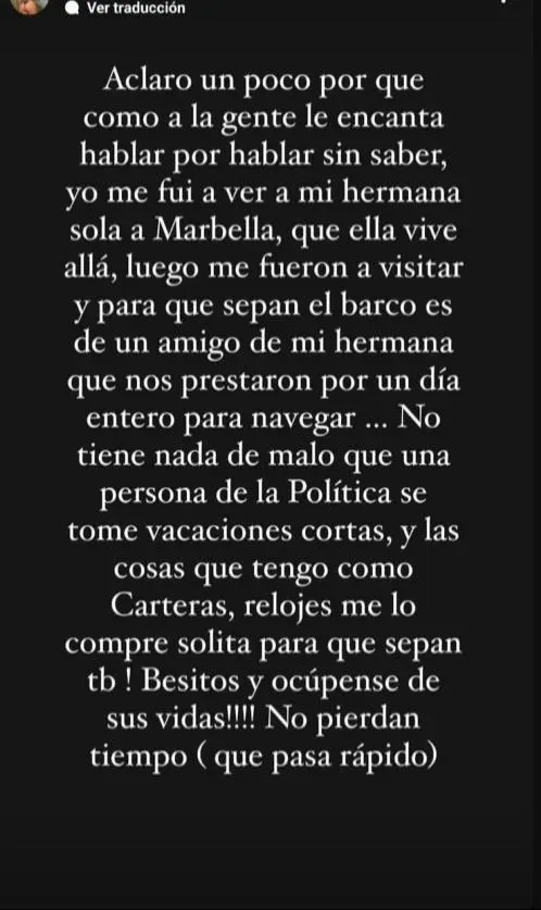 En su Instagram, Clerici señaló que: "Aclaro un poco, porque como a la gente le encanta hablar por hablar sin saber, yo me fui a ver a mi hermana sola a Marbella, que ella vive allá, luego me fueron a visitar y para que sepan el barco es de un amigo de mi hermana que nos prestaron por un día entero para navegar".