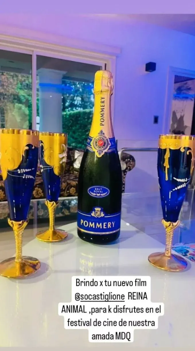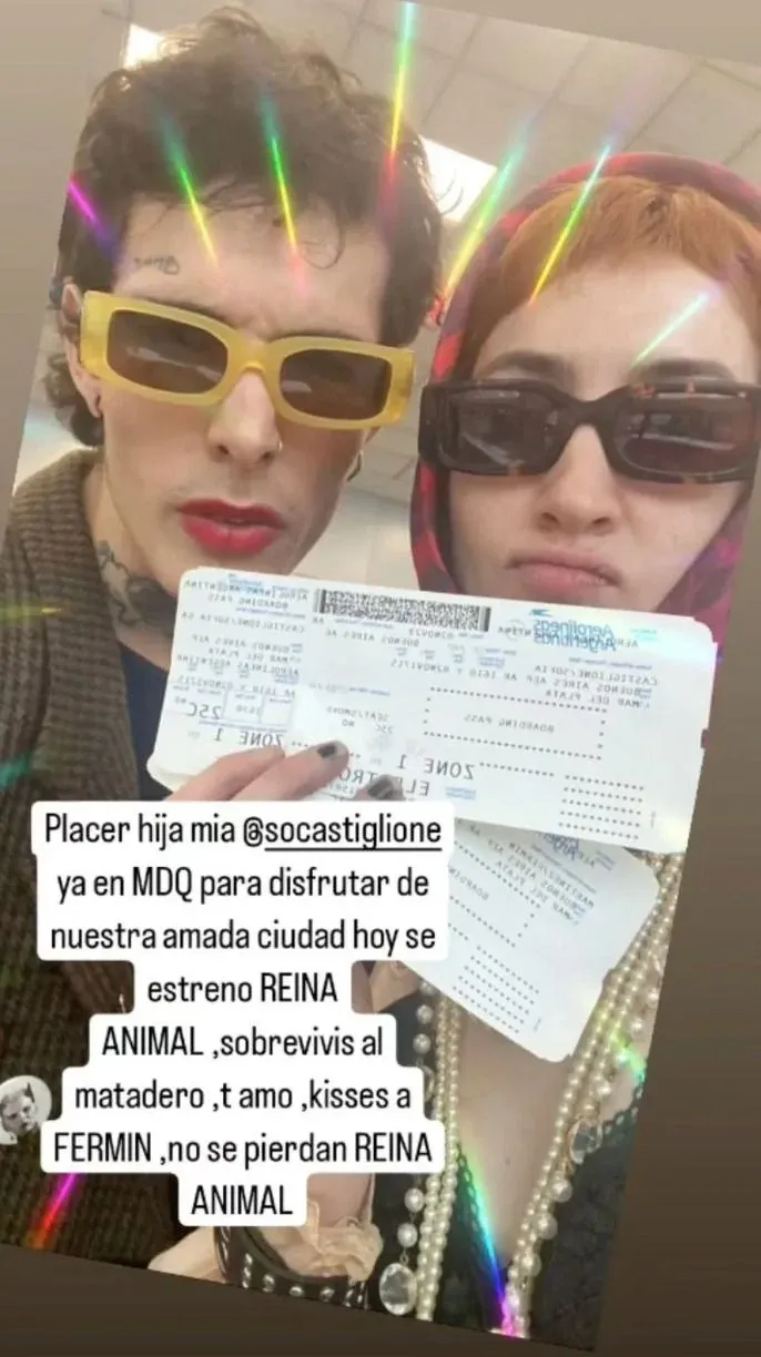 "Brindo por tu nuevo film, Reina animal, para que disfrutes en el Festival de Cine de nuestra amada MDQ". Y en otra historia, escribió: "Placer, hija mía. Ya en MDQ para disfrutar de nuestra amada ciudad. Hoy se estrenó Reina animal. Sobrevivís al matadero, te amo. Kisses a Fermín, no se pierdan Reina animal".