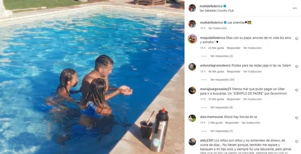 En otra publicación, Defederico compartió una imagen en la que aparece con las pequeñas en la piscina, acompañada del mensaje: "Las sirenitas" junto a un emoji de un corazón y una coronita. La foto generó diversos comentarios, algunos expresando apoyo y otros criticando.