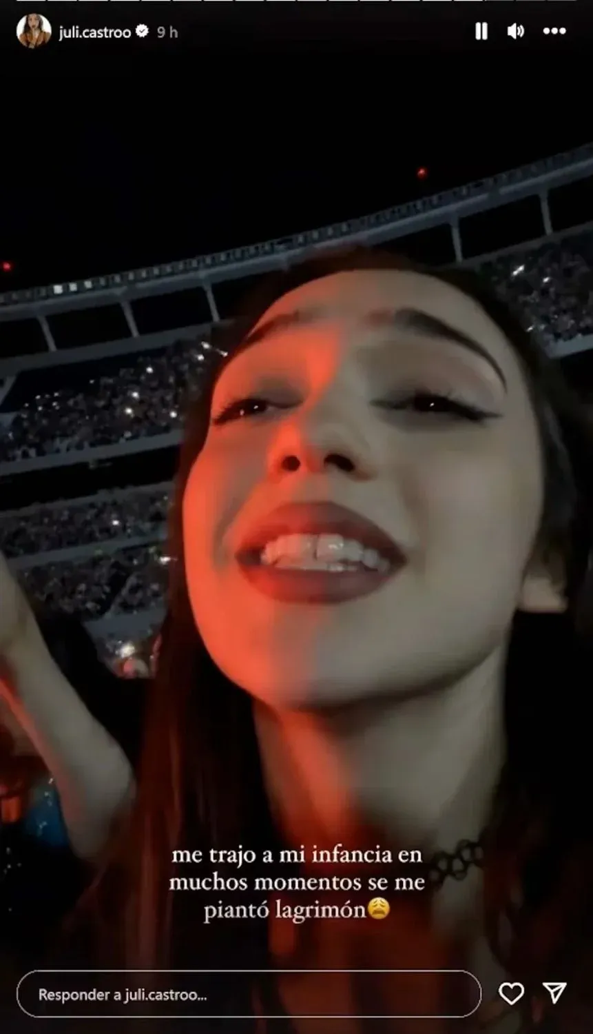 Juli Castro, hija de Momi Giardina y participante del Bailando 2023, compartió fragmentos del show en sus historias de Instagram, expresando su emoción al decir: "Me trajo a mi infancia. En muchos momentos se me piantó un lagrimón".