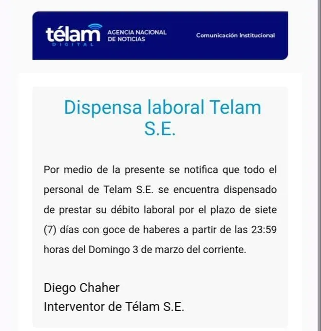 “Por medio de la presente se notifica que todo el personal de Télam S.E. se encuentra dispensado de prestar su débito laboral por el plazo de siete (7) días con goce de haberes a partir de las 23:59 horas del domingo 3 de marzo del corriente”, asegura el comunicado difundido este lunes por el interventor Chaher.