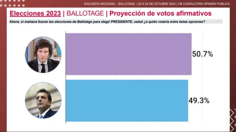 Dentro de esa misma línea se mueve la consultora CB que le daba una ventaja de más de 2 puntos a Milei y ahora tendría una diferencia superior.